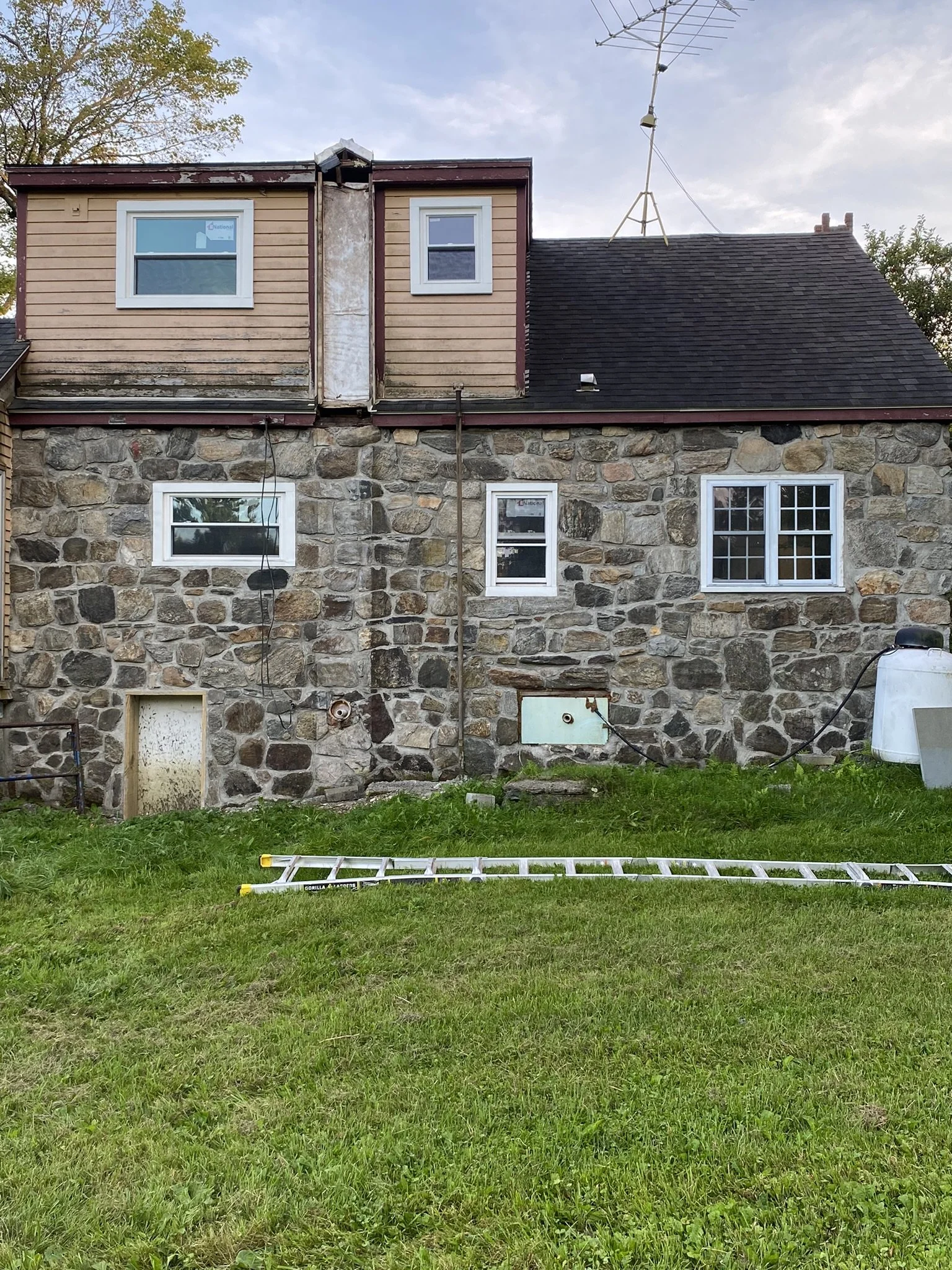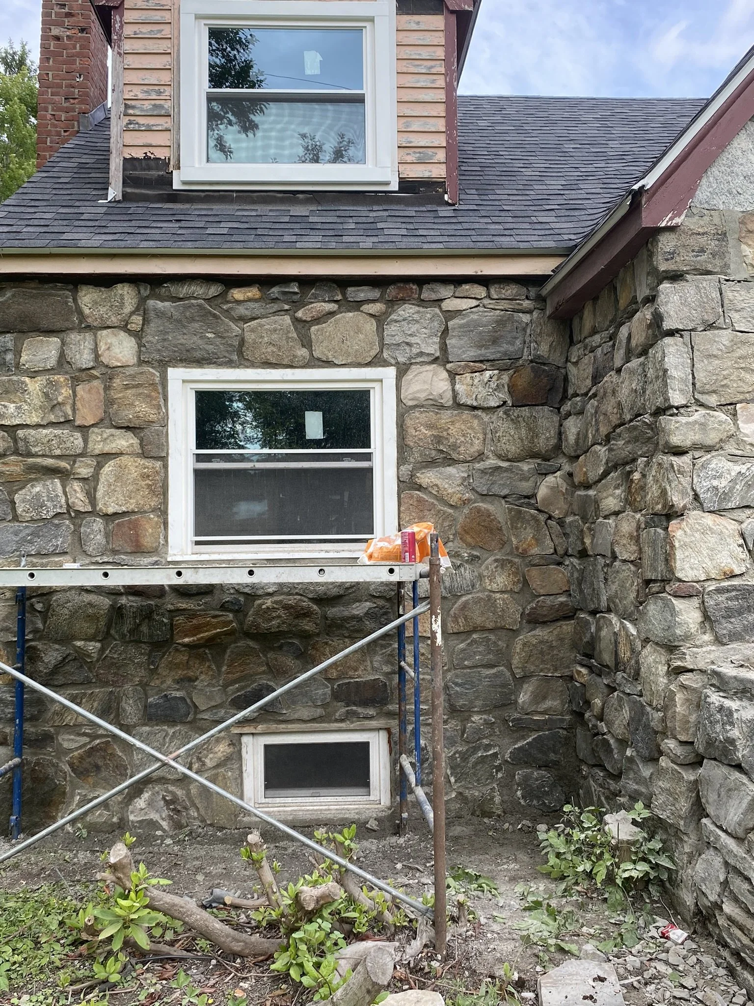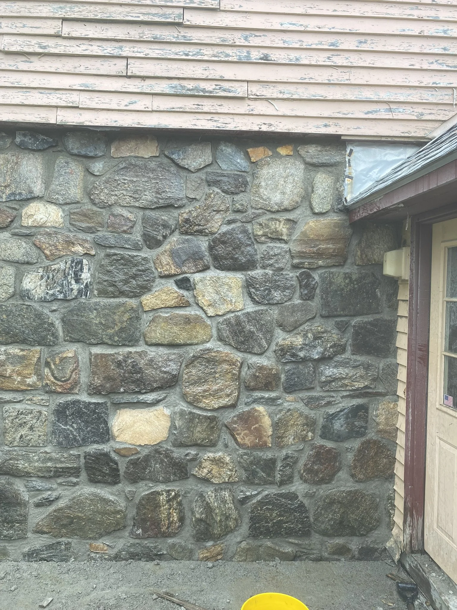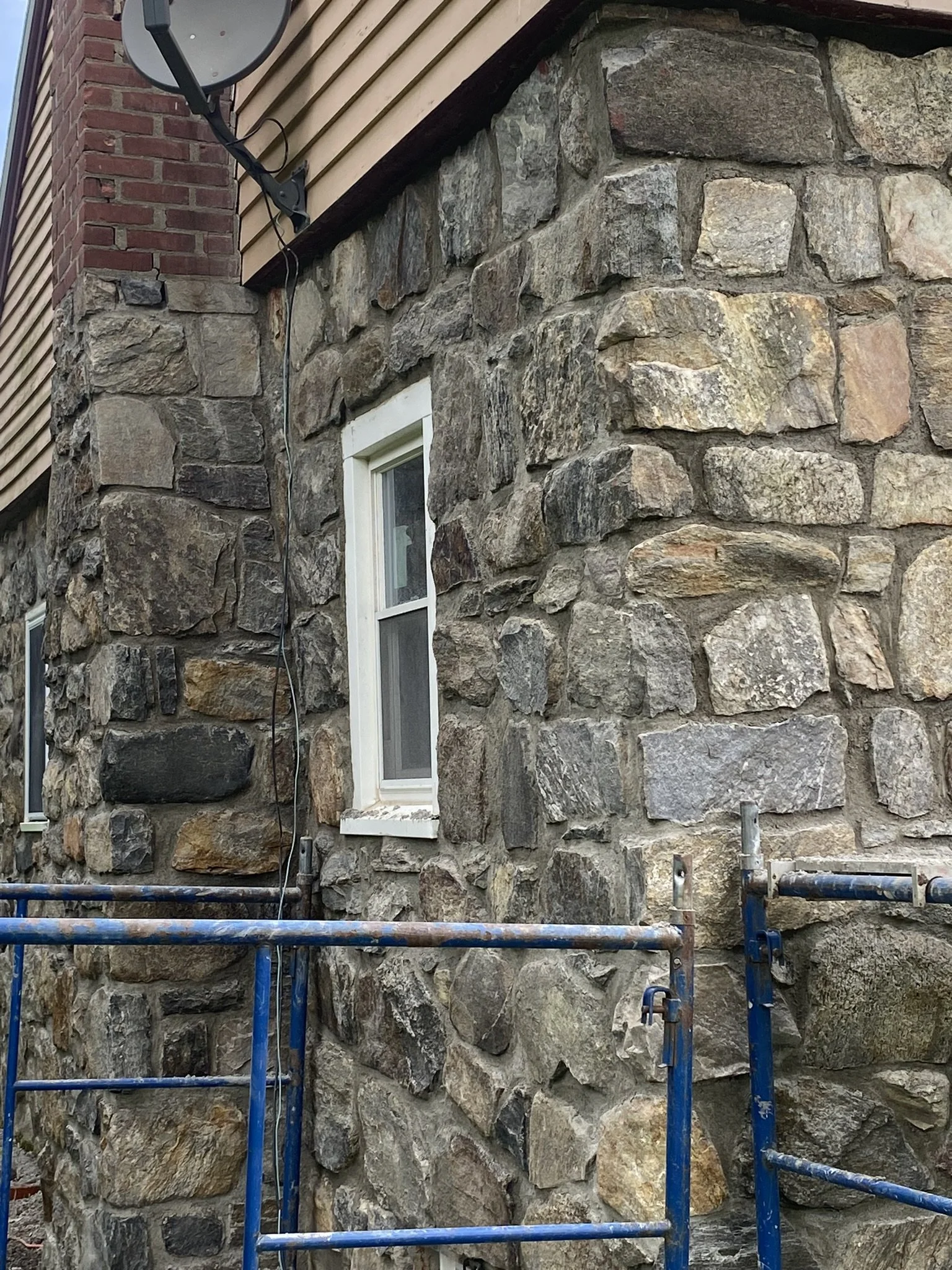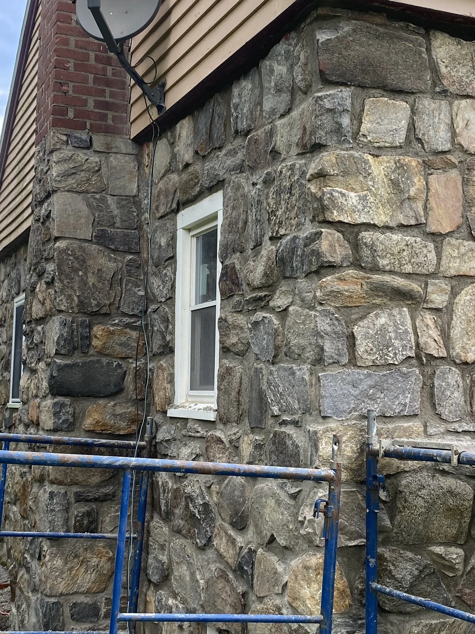 This homes stone veneer was failing in several areas. Stones were reset and all the mortar joints were cut out and the repointed. We also deleted a window for the client and seamlessly hid the opening with stone. The chimney was also failing on this house, so it too was torn down and rebuilt.